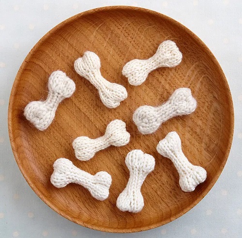 This small knitted dog bone by Julie Williams is a fun and fast project. It works well as a toy for pets or a cute prop. You can finish it quickly using leftover yarn.
