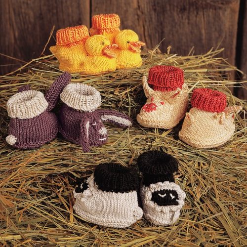 Susan Flanders has created this pattern in four sizes and four different designs. Ducks, rabbits, pigs, or sheep, whatever you pick, you can knit them all. It is knitted with sport-weight yarn and needle sizes US 1 and 3.