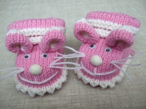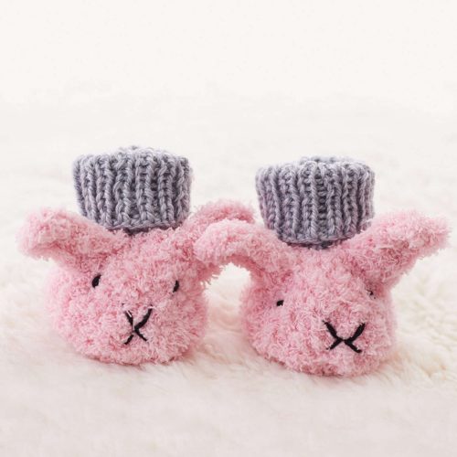 An intermediate pattern by Yarnspirations in precious pink booties is knitted using US 6 double-pointed knitting needles. The eyes and nose are embroidered with black embroidery floss.