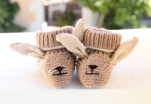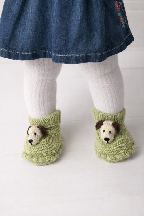 The tonal shades of pale green yarn make these cute little doggie slippers by Sweet Living easy to knit in an evening. If your baby loves playing with dogs, these booties are perfect for them.