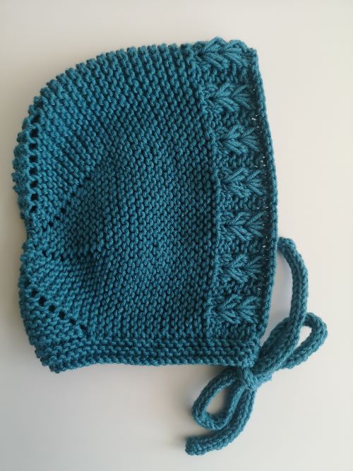 Inspired by the Norwegian Fir cardigan design, Espace Tricot has knitted this lovely petit pins bonnet. The bonnet features an all-over lace pattern, easy garter stitch, ribbing at the back, and a soft icord tie.
