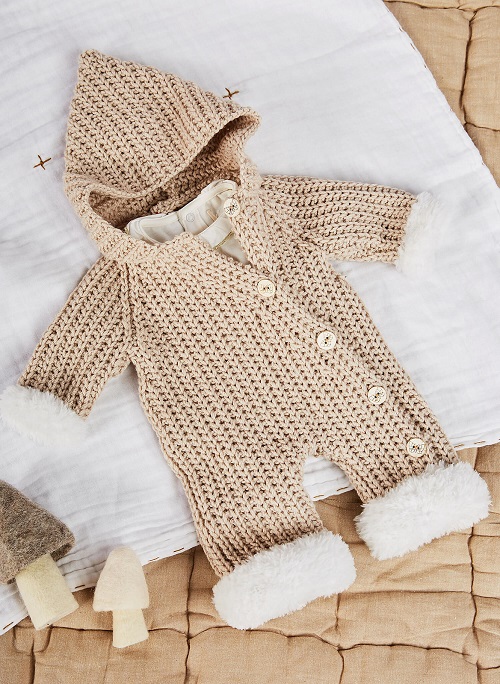Have a look at this cozy onesie baby by Bergère de France. The fleecy edging and ribbed texture give it a unique look with a soft, comfy fit. It features a simple shape, soft edges, and a button closure, making it easy to change.