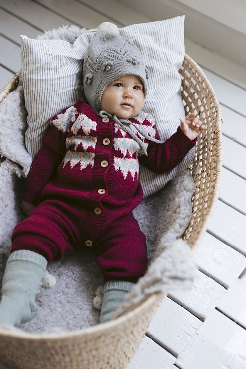 Try your hand at this taika babies onesie pattern by Sari Nordlund. It features a clean, modern design with soft shaping and a comfortable fit for little ones. It has frosty berries, giving it a Scandinavian look. Plus, it’s perfect for everyday use and makes a handmade gift.