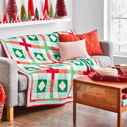 Kelli Marshall designed a merry holiday throw in mint green and aqua, livens the traditional Christmas color canvas of red and green. This throw on your couch will add to the festive season theme.