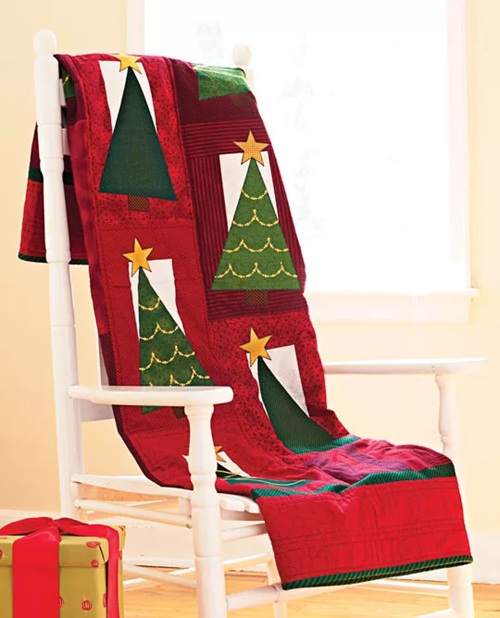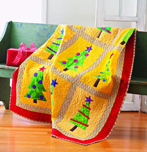 A quilt project by Joanie Holton, which looks attractive in red, green, and white, consisting of Santa Claus, gifts, and pine trees. You can use it as a throw or a lap blanket. Try gifting this to your loved ones.