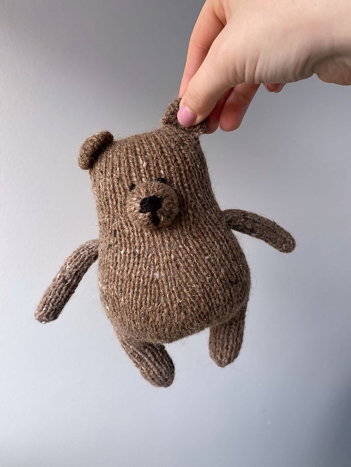 A huggable bear knitting pattern by Kristina includes clear, step-by-step instructions. The body is knitted in the round; the arms and ears are knitted in the round from picked-up stitches.