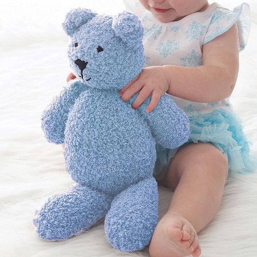 A pretty teddy bear from Yarnspirations is suitable for snuggling and cuddling. It measures approximately 14 inches long, making it perfect for children’s hands.