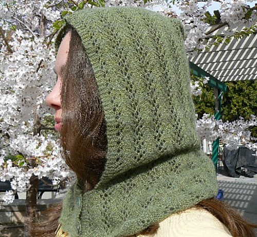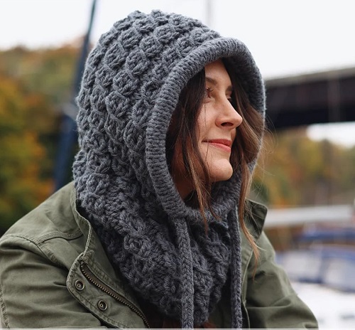 Jennifer Miller Comstock is behind this excellent lace hood. It has a lace pattern that adds a simple, stylish look without being complicated. It’s perfect for knitters who want a cozy yet refined winter accessory.