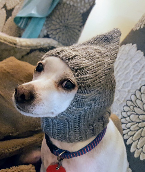 Jenya Rose knitted a hat for your furry friend, worked from the top down, i.e., starting at the ribbed areas above the eyes, then making the pointy cap, and ending at the turtleneck.