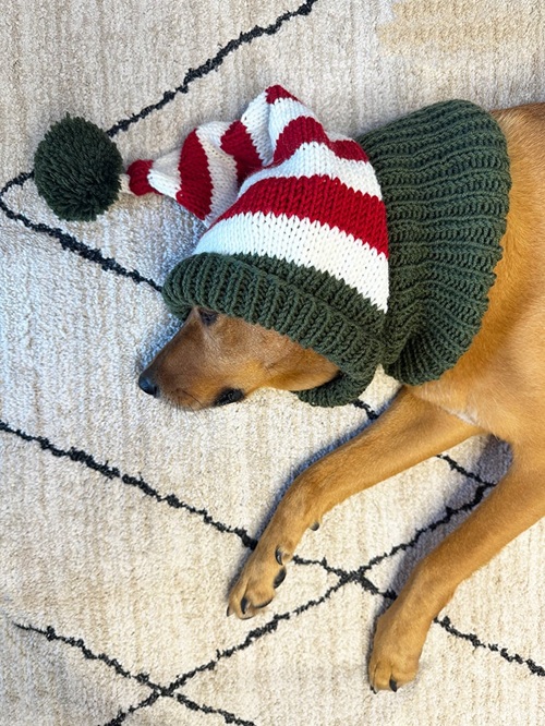Please keep cookies and milk right on the floor by the fireplace for this cute Santa. This hat by Lucky Fox Knits was designed so that the pom pom would naturally fall to one side of your dog’s cute face.