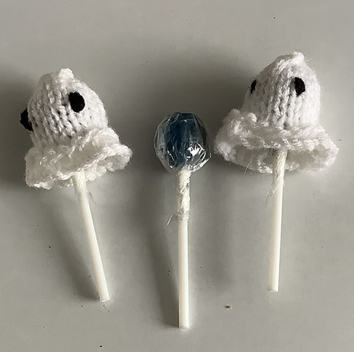 This lollipop cover by Taffy Lass Knits will fit the smallest size sweet lollipop. The eyes are sewn on, but you could use stick-on ones or even small black buttons. It is knitted in double knitting using plain and purl stitches throughout.