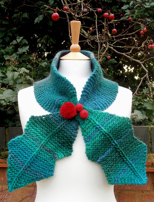 Forget the cherry on the cake! Anni Howard designed a crossover scarf with a cherry-like pom-pom. It comes in one size but can be adjusted. The needle sizes used are US 9 and US 10½.