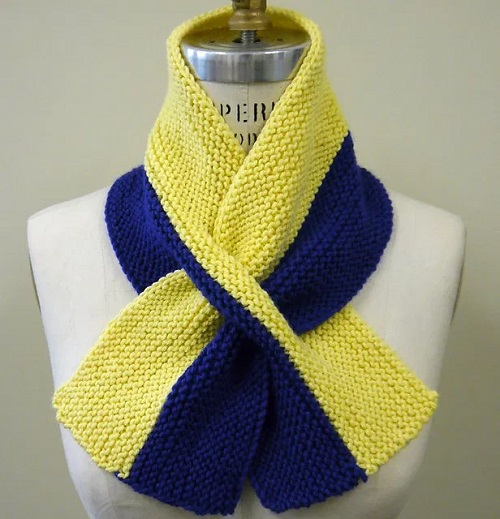A blue and yellow scarf by Andra Asars is knitted in worsted yarn and is available in one size. The knitting gauge is 18 stitches and 36 rows to 10 cm in garter stitch using a US 8 needle size.