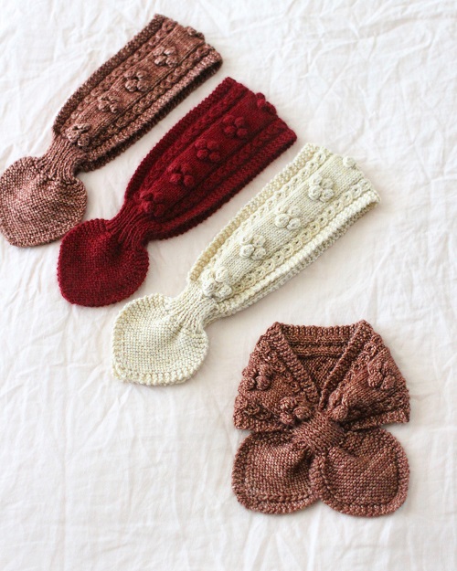 A traditional bow tie scarf by Ayeong Son features bobble and knot details. The scarf is very light and easy to carry, as this pattern includes sizes for kids and adults. You can wear the same scarf and twin with your kid.