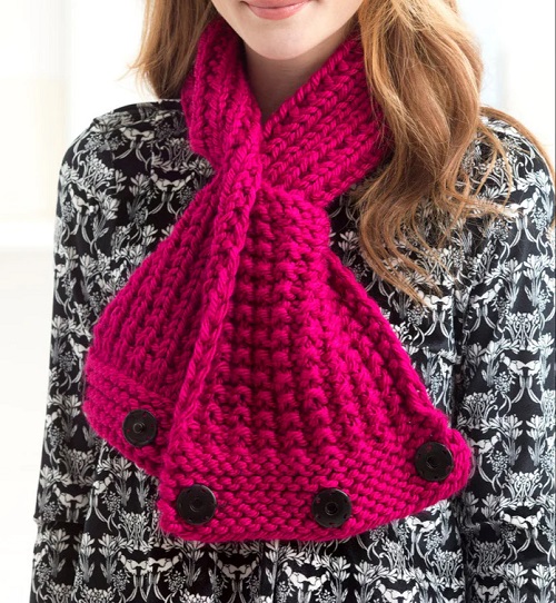 A magenta pink slit scarf by Lionbrand is made with super bulky weight yarn, and the buttons at the end add drama to it. You can gift these to your loved ones.