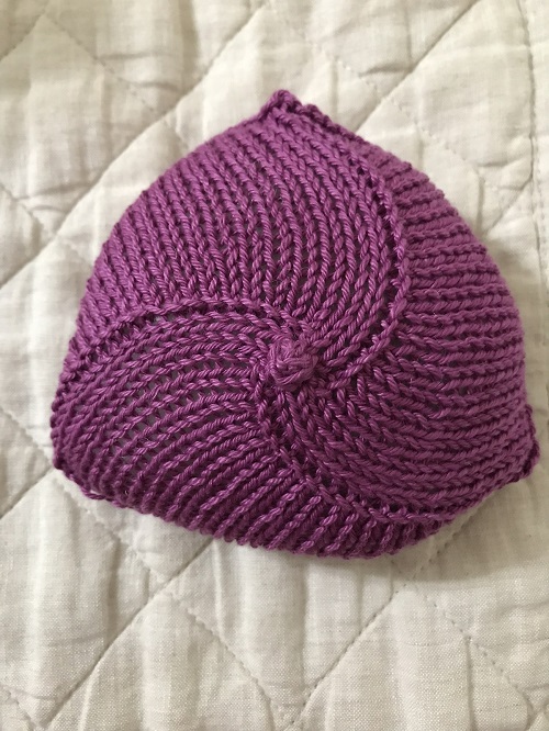 Melissa Friedlund created a round knocker to use as a teaching aid for your kids. It is knitted in the round, modular, and uses thicker yarn and therefore a different number of stitches. You can also forgo the base and make it into a baby hat.