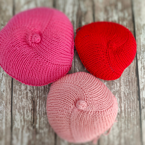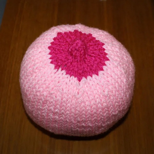 These knockers are knitted top-down in the round (from the tip of the nipple). You can easily add or remove rows, or increase or decrease them, according to you. It is knitted using DK-weight yarn on DPN or circular needles using the magic loop method.