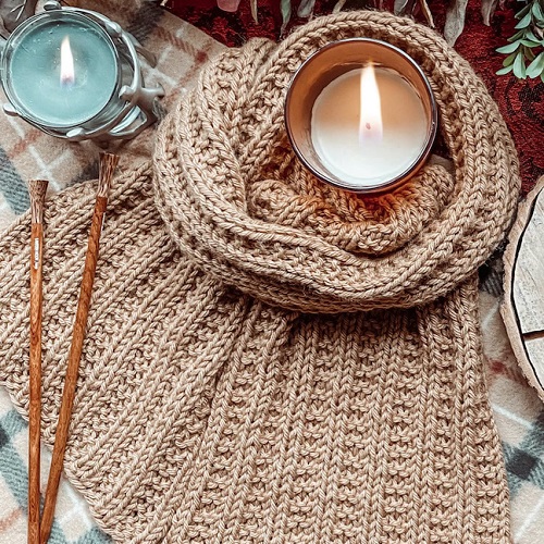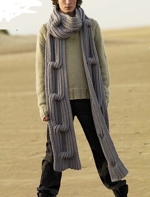 Have a look at this Canadian-style men’s muffler from Inese Sang. It has a clean, classic look that suits everyday winter wear. The textured stitch pattern adds subtle detail without making the design feel heavy. To make this, you need sport yarn, US 4 – 3.5 mm knitting needles, and basic knowledge of stitches.