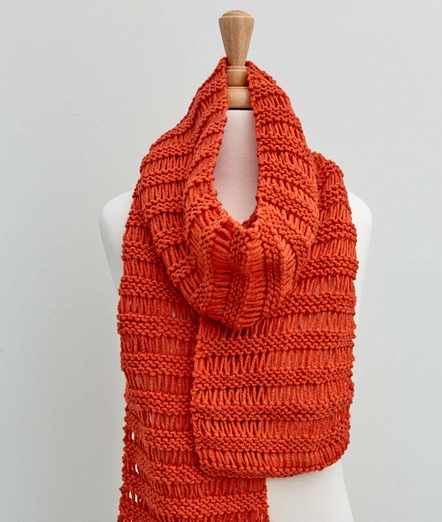 The slipped stripes scarf is a good choice if you want a simple pattern with a bit of visual interest. It uses easy stitches to create clean stripes that give it a little modern look. Yarnspirations is behind this scarf. You can easily customize its length and color.