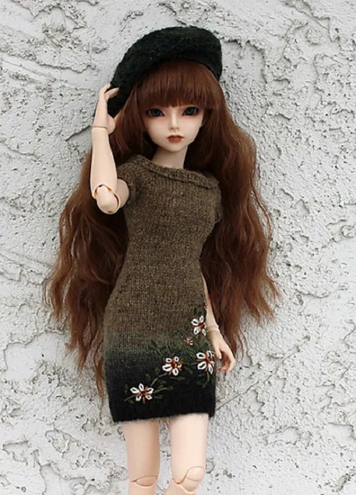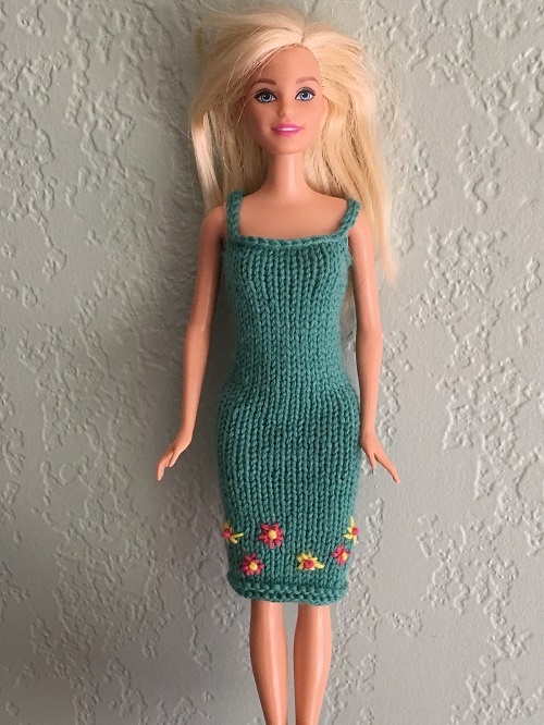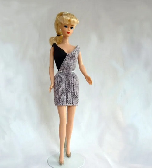 Look at this beautiful knitted dress by Stickatillbarbie.se. It features a fitted bodice with thin straps that give the dress a neat look. Pair it with small accessories like a necklace, a tiny bag, or doll shoes to make it more appealing.