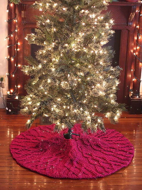 Alison Green designed a Christmas tree skirt. This cable knitting pattern begins in the center and is worked to the outer edges. It measures approximately 45 inches in diameter.