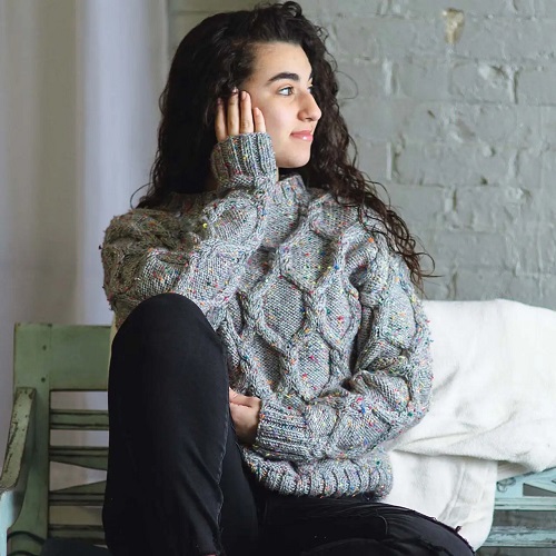A textual masterpiece, this chic sweater pattern and bold cable patterns bring fun multicolor flecks to this sophisticated design. This Herrschners sweater is worked flat in four pieces, then seamed together before the neckline is worked in the round.