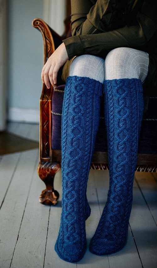 Minna Metsänen created a sock pattern that is cast on 80 stitches and distributed onto four double-pointed needles. If you want wider calves, cast on 88 stitches, with four stitches on the ribbing on both sides of the cables.