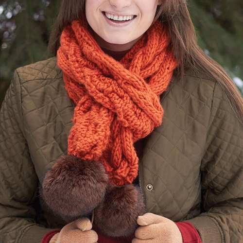 The orange color is best suited for autumn. This Yarnspirations Scarf pattern is available in one size and will grace any winter dress in the fall season.