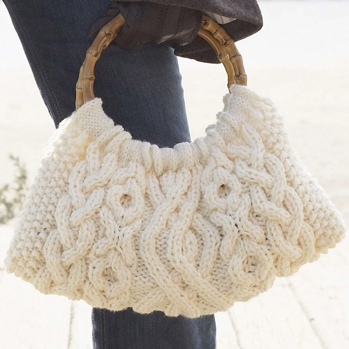 A Yarnspirations bag pattern looks chic and classy in white. The beautiful cabled purse will be a perfect accessory for your date-night dress.