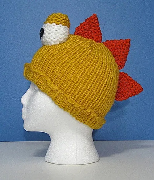 How crazy it will be to carry the extinct species, dinosaurs, on your kid’s head? Tanya Goen created a fancy hat by loom-knitting in yellow and orange colors with popping eyes.