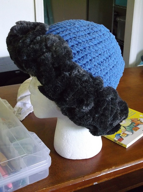 Use your leftover yarn for Joan Neumann‘s cute hat, which is fuzzy and soft. The knitting gauge is four rows per 1 inch, and hook sizes used are 3.75 mm (F) and 3.25 mm (D).