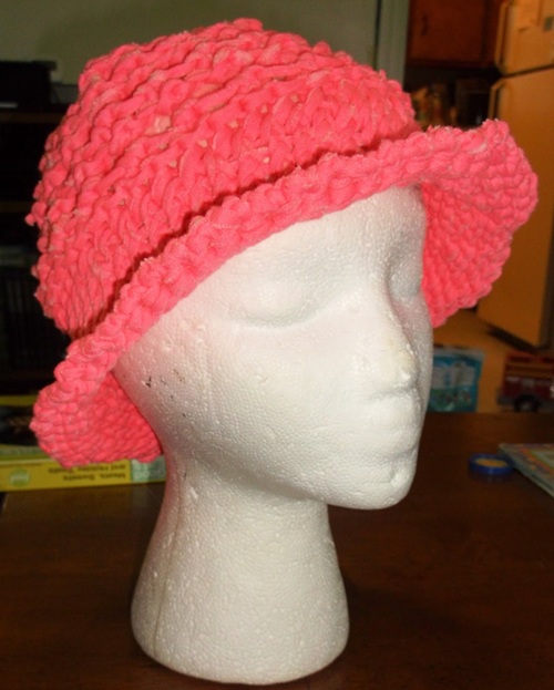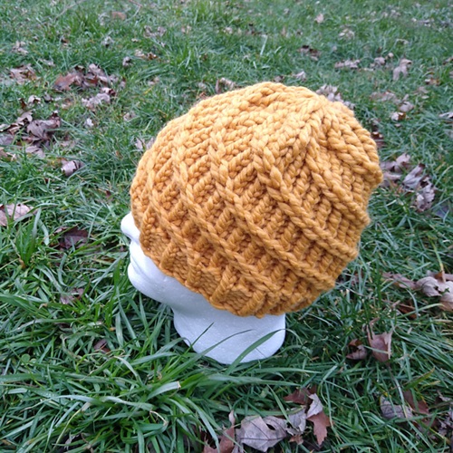 The loom-knit hat, featuring a short ribbed brim and a spiral-patterned body, by Ms Yarn is made on a 41-peg extra-large-gauge round loom. The finished hat height measures 8.5 inches, and the circumference is 18 inches.