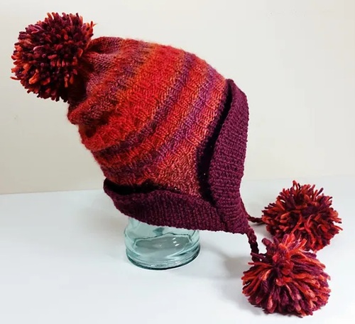 Bethany A Dailey is behind this berry bonnet. It’s a sweet and cozy little hat that’s easy to make on the loom machine. This design is unique in that it is styled to be worked from the crown down to create those playful points at the ears.