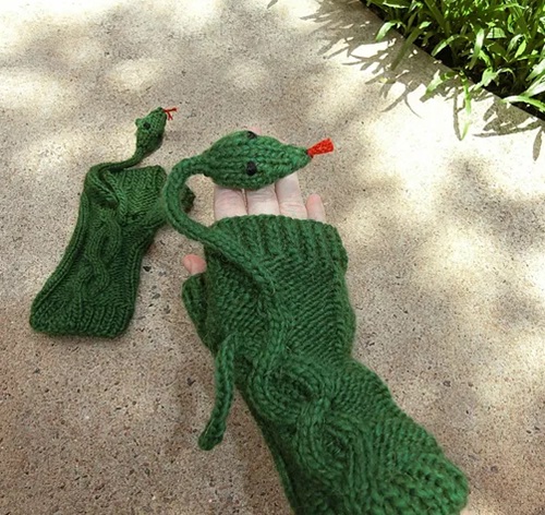 The cables, coiled into a snake, look appealing and scary. Shawn Torres created this unique intermediate-level pattern featuring embroidered eyes and tongue.