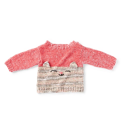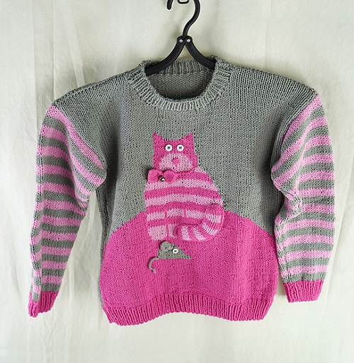 This long-sleeved pullover for children by Amy Bahrt is available in sizes 2,4, and 6. The cat has a striped pattern with a bow and a cute little mouse with buttoned eyes.