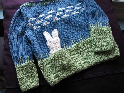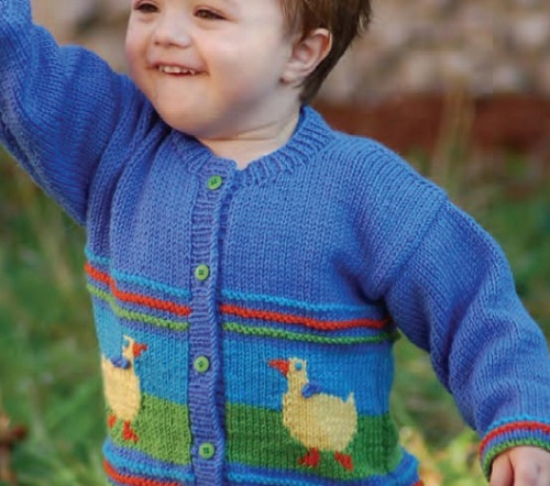 Amy Bahrt designed a long-sleeved cardigan for children featuring intarsia ducks on a grassy background. It features stripes in blue, red, and green colors.