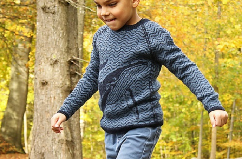 The beautiful and majestic whale featured on Karen S. Lauger’s sweater pattern is suitable for children aged 4, 8, and 12 years. This is available in various languages, including Danish, German, and English.