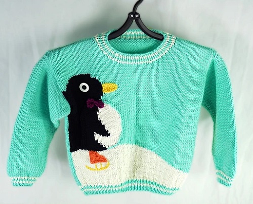 A long-sleeved child’s sweater pattern featuring a cute penguin, designed by Amy Bahrt, includes a hidden conventional pocket. An intermediate skill level pattern is available in sizes 2, 4, and 6, with a knitting gauge of 20 stitches and 24 rows = 10 cm in stockinette stitch.