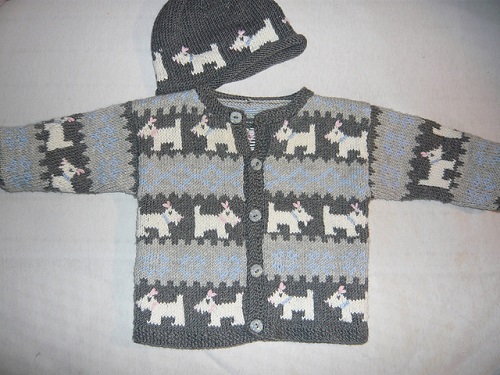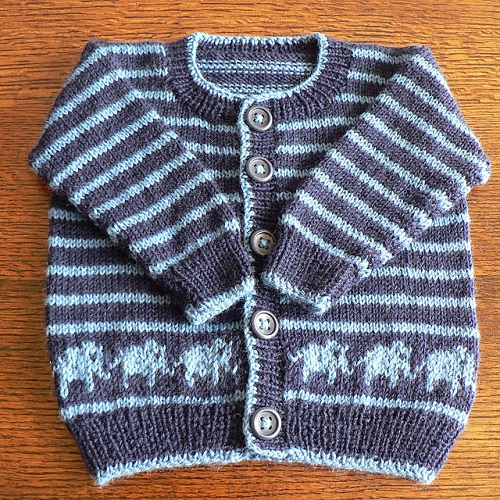 A newborn cardigan by Lisbet Clements features a modified drop-shoulder design, worked flat, back and forth, from the hem to the top. Elephants in a contrasting color walk around the bottom of the cardigan, and the sleeves are worked in stripes.