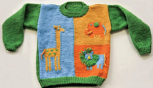 The color work on this pullover is just excellent, knitted by Amy Bahrt. The colorful giraffe, elephant, and lion on blocks make this pattern more attractive.