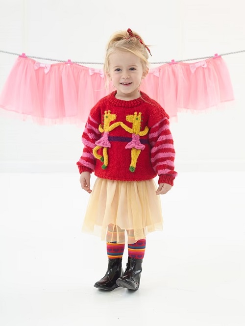 It is an intermediate knitting pattern by Lion Brand Yarn that features two giraffes wearing ballet dresses and photographed while dancing.