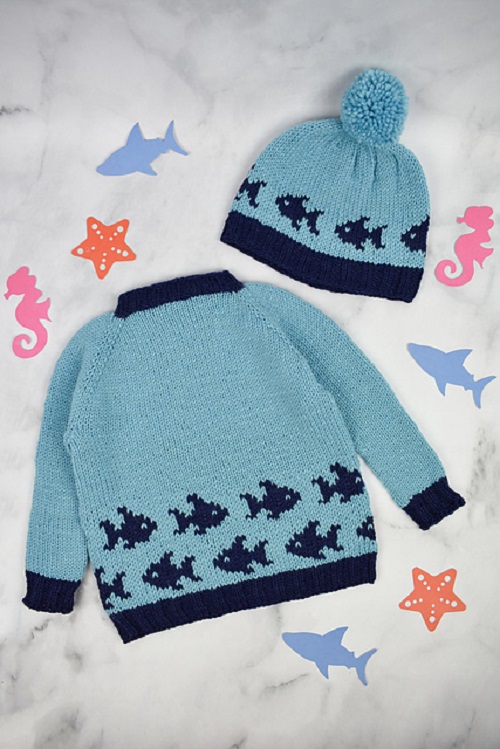 Rachel Brockman’s sweater and duo features cute little fish swimming across the surface of the fabric. With the dark blue color, it highlights the collars, cuffs, hem, and sleeves.