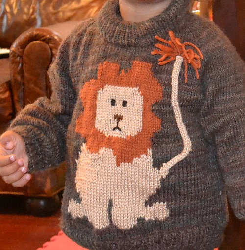 Natalie Bayer designed this long-sleeved sweater featuring a lion for advanced intermediate knitters. The tail of it adds all the drama to this pattern.
