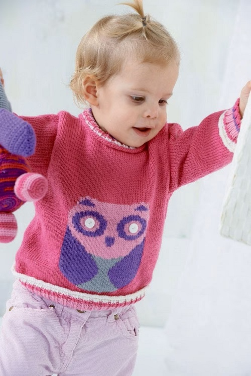 Schachenmayr’s sweater pattern, crafted with fingering yarn weight, is a delight to make and could be your next masterpiece. The owl contrasts perfectly with this pink colored sweater.