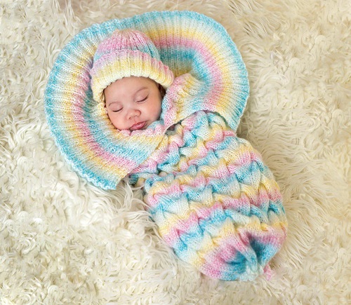 Inspired by candy corn colors, this cocoon by yarnspirations stands out with its fun look. It is simple to knit and perfect for themed photos or special occasions while still keeping the baby warm and cozy.