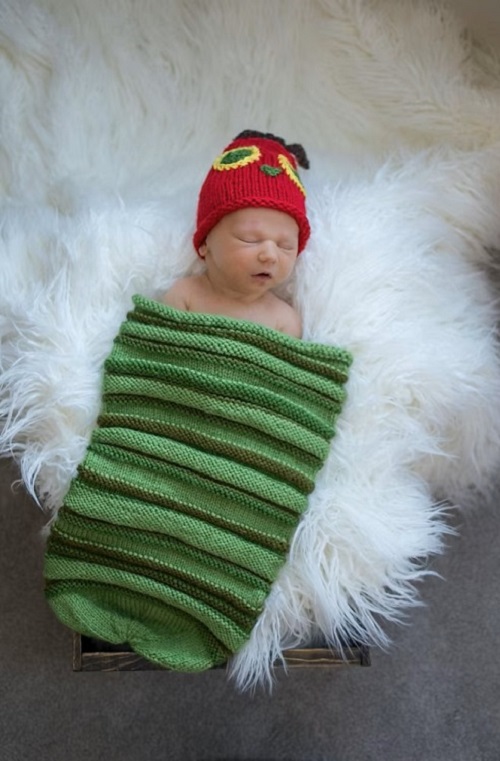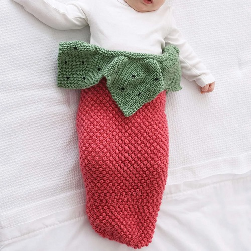This playful strawberry-themed cocoon by yarnspirations adds a fun touch to baby outfits. It is soft, comfortable, and great for photos, while still being useful for keeping the baby warm during cooler days.