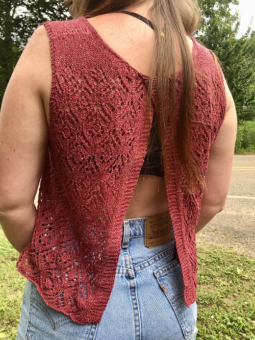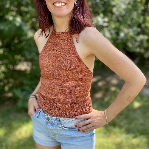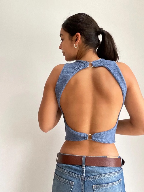 Viktória Kun-Tomán is the designer behind this beautiful backless top pattern. It is knitted seamlessly from top to bottom flat until the body, and then it is worked in the round. To knit this, you need to have US 3 knitting needles.