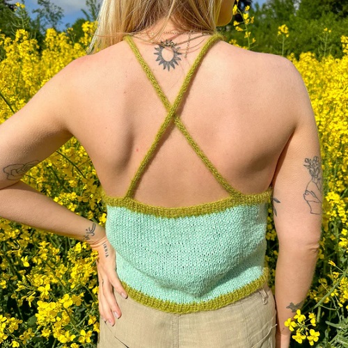 A festive summer top by Hobbii in a pastel shade of green, bordered with light green, looks elegant. It features a low-cut open back with crossed straps, and this top is elastic, made up with a negative ease of approximately 4-6 inches.