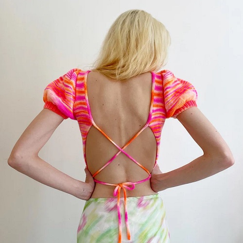 Flaunt your beautiful back in this vibrant backless top from Anxious Girl Knits. It has a boat neckline, accentuating your collarbone with puff sleeves and a little coverage at the back.