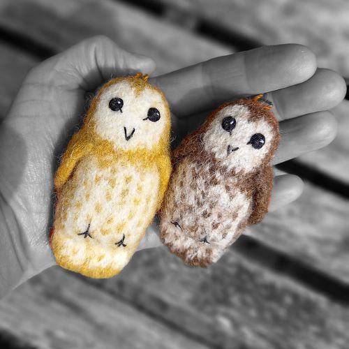 Woollen Wave has knitted this barn owl in soft toy design. It features a round body with a smiling facial expression and small wings. The owl is knitted in the round with colourwork, lightly shaped, wet felted, and finished with embroidered features.